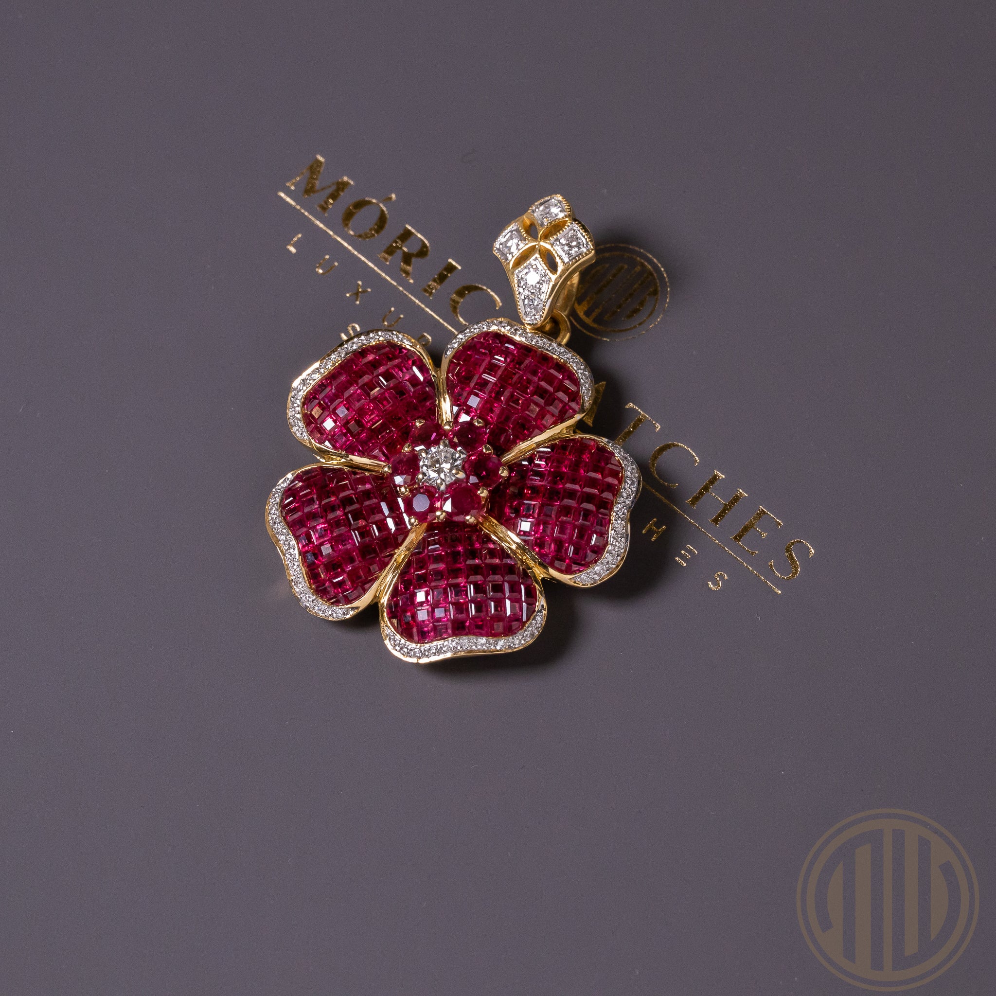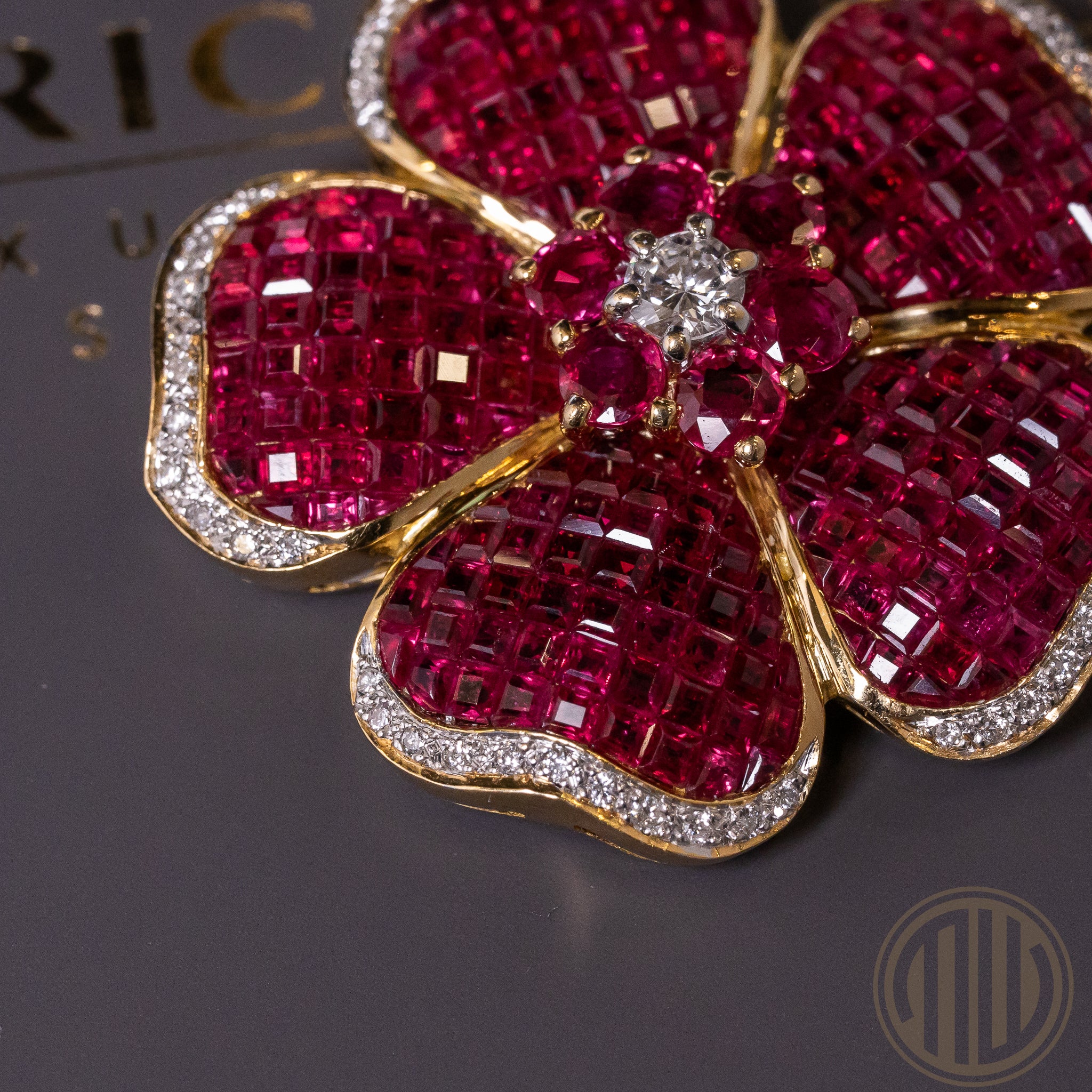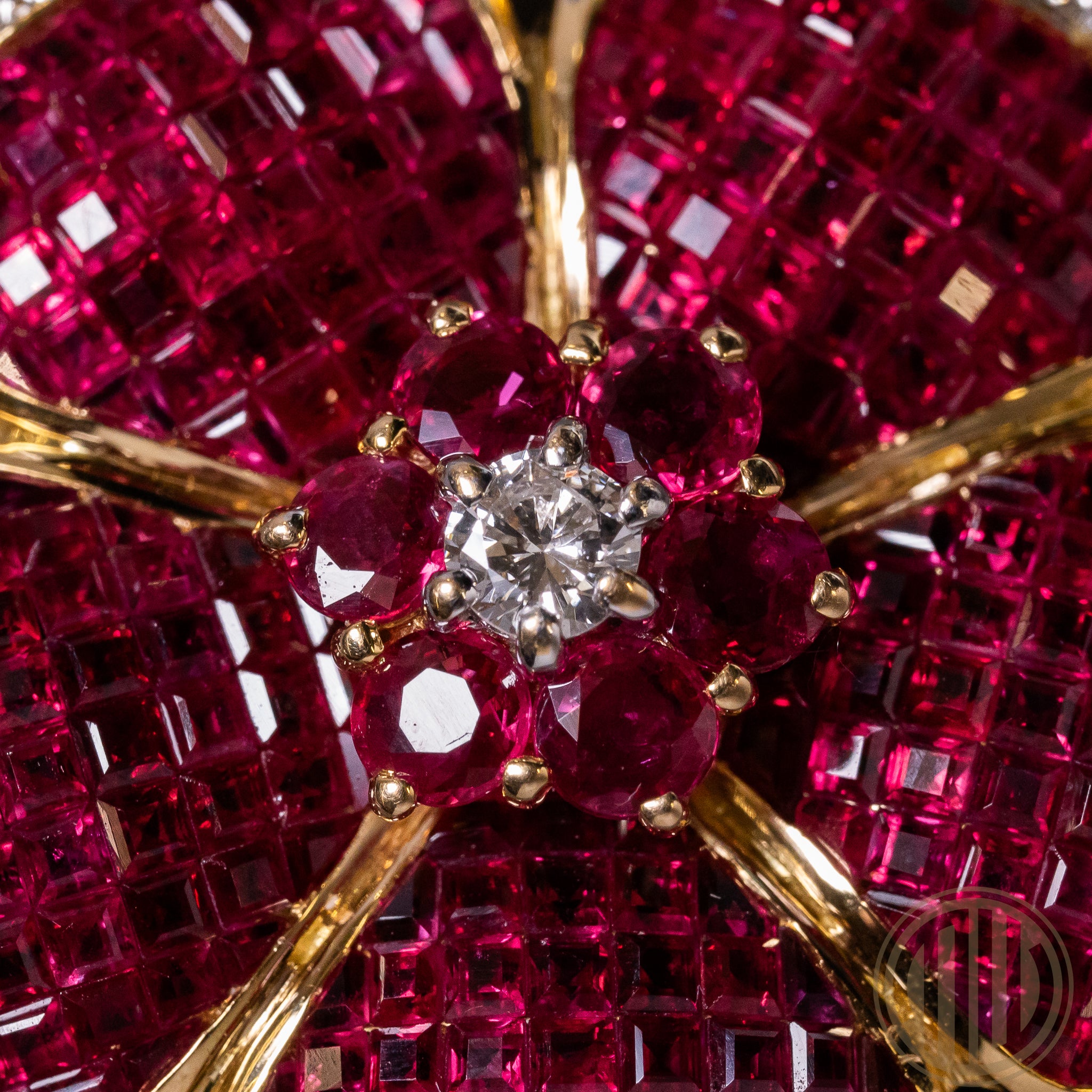 Die Blütenblätter sind mit insgesamt 216 natürlichen Rubinen besetzt, die in einer fein abgestimmten, mosaikartigen Fassung verarbeitet wurden. Diese Technik erzeugt eine nahezu geschlossene Edelsteinoberfläche und erinnert in ihrer Wirkung an die berühmte unsichtbare Fassung klassischer Haute Joaillerie. Die Rubine – rund facettiert sowie im Treppenschliff ausgeführt – besitzen ein Gesamtgewicht von ca. 5,55 ct und überzeugen durch ihre intensive, gleichmäßige Farbgebung.