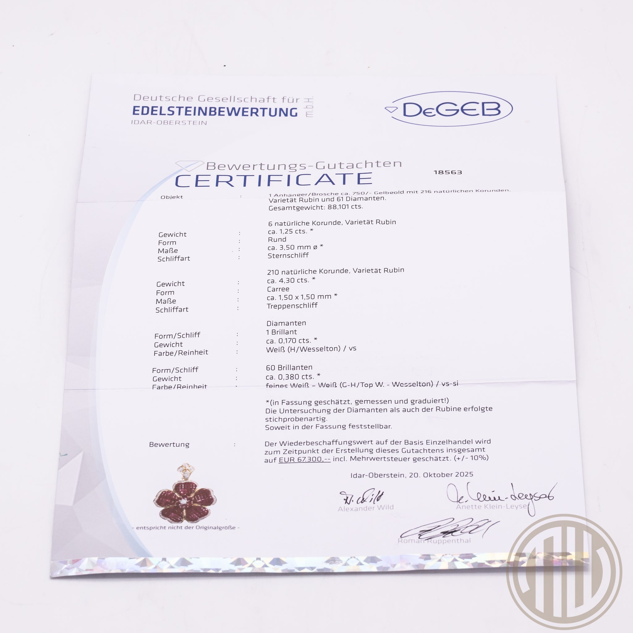 Die Qualität und Echtheit der verwendeten Edelsteine sowie der Wiederbeschaffungswert wurden durch die Deutsche Gesellschaft für Edelsteinbewertung (DeGEB), Idar-Oberstein, in einem unabhängigen Gutachten bestätigt. Der im Zertifikat ausgewiesene Wiederbeschaffungswert beträgt EUR 67.300,– inkl. MwSt. (±10 %).
